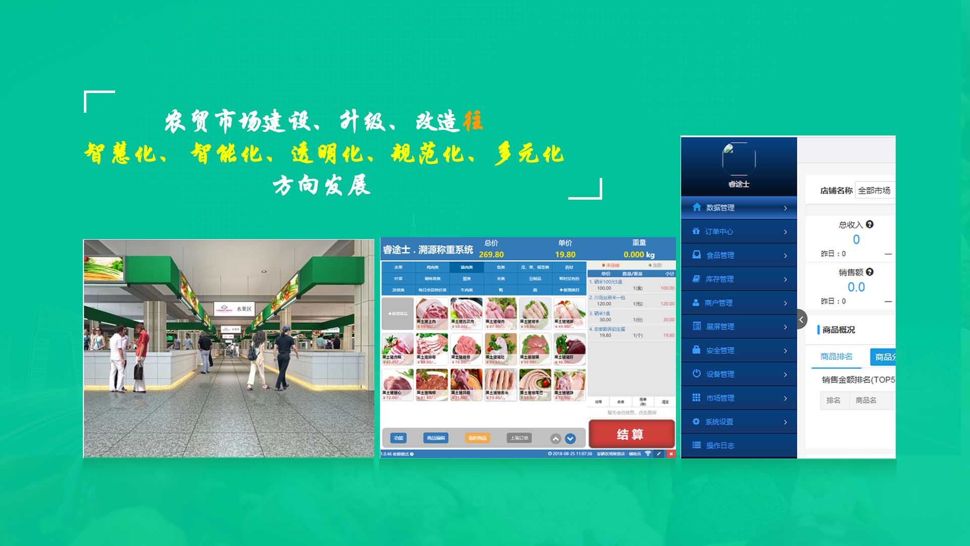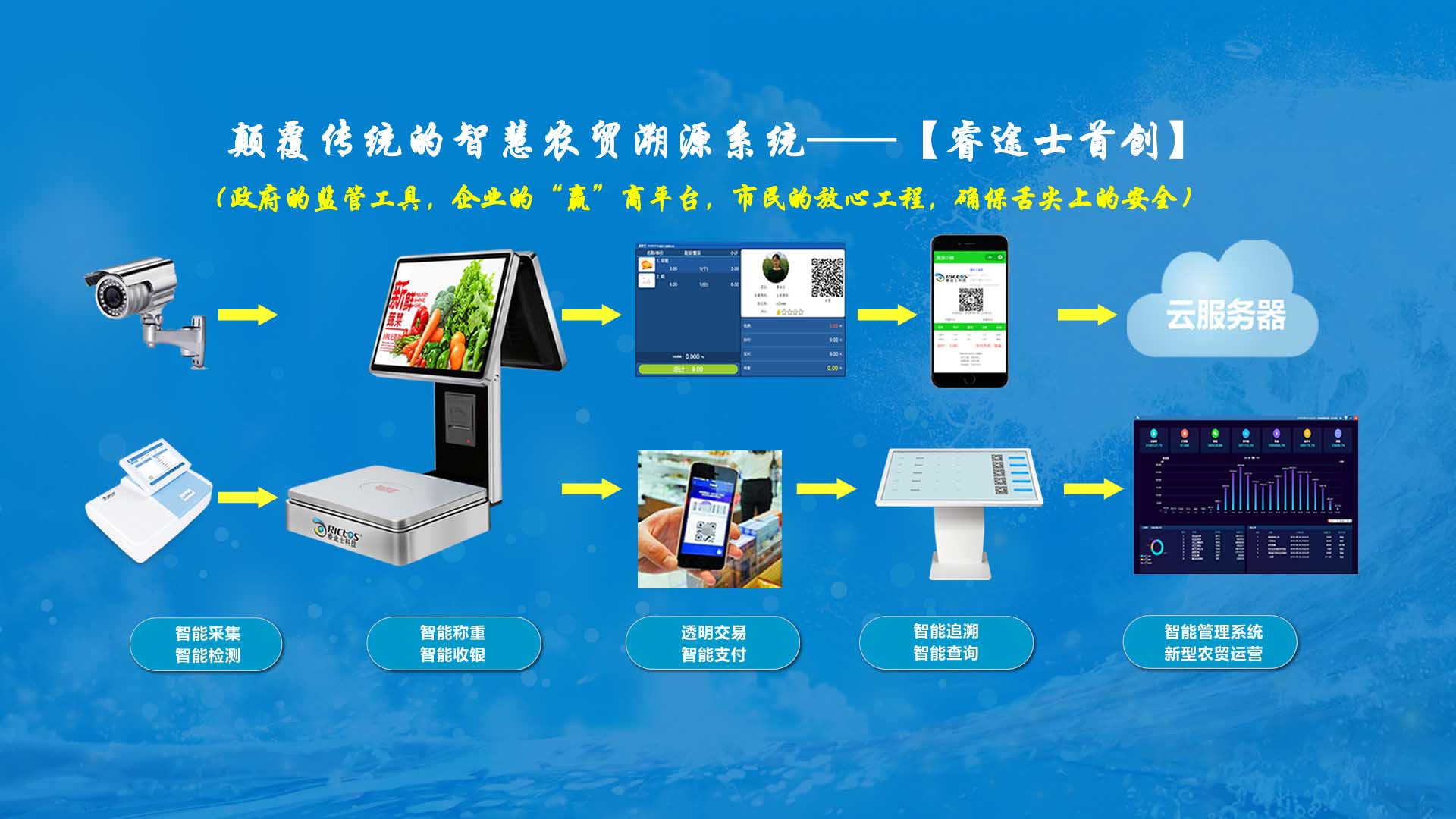 創(chuàng)新實現(xiàn)了【智慧農貿溯源管理系統(tǒng)】與【智能稱重收銀】一體化解決方案,集市場管理、運營管理、溯源追溯、智能收銀大數據運用于一體,硬件、軟件與管理系統(tǒng)完美結合。適用于農批、農貿市場蔬菜、生鮮、水果、水產、肉類、熟食等稱重和非稱重銷售;由于采用一體化設計,解決了傳統(tǒng)農貿市場無法實現(xiàn)的信息化、智能化、可追溯的管理問題;使稱重、收銀、追溯、管理、更透明、公正、安全,讓顧客無后顧之憂,給管理工作帶來極大的便捷與高效,對國內農產品行業(yè)的發(fā)展、農產品流通管理起到了典范作用。 【睿途士首創(chuàng)】顛覆傳統(tǒng)的“智慧農貿市場系統(tǒng)”,解決了傳統(tǒng)農貿系統(tǒng)單一安卓掛屏,昂視不方便看、不直觀、無互動性,傳輸信息不齊全、不穩(wěn)定的問題,也解決了按鍵電子秤商品難找、商品代碼難記、按鍵操作不靈活、支付不智能,對收銀管理、銷售商品、菜名、菜價、打折、優(yōu)惠、會員、線上下單、采購等無法實現(xiàn)實際菜品交易和追溯等問題。 更具顛覆性的是睿途士智慧系統(tǒng)擁有三大管理平臺(市場管理平臺、總部運營管理平臺、商戶后臺管理平臺)、一個可視操作前臺和三大追溯功能,讓遠程管理、數據傳輸、人機互動、智能控制、移動支付、大數據、互聯(lián)通信、云端存儲、人工智能、智能城市、電子定位、智能收銀等功能得以實現(xiàn)。